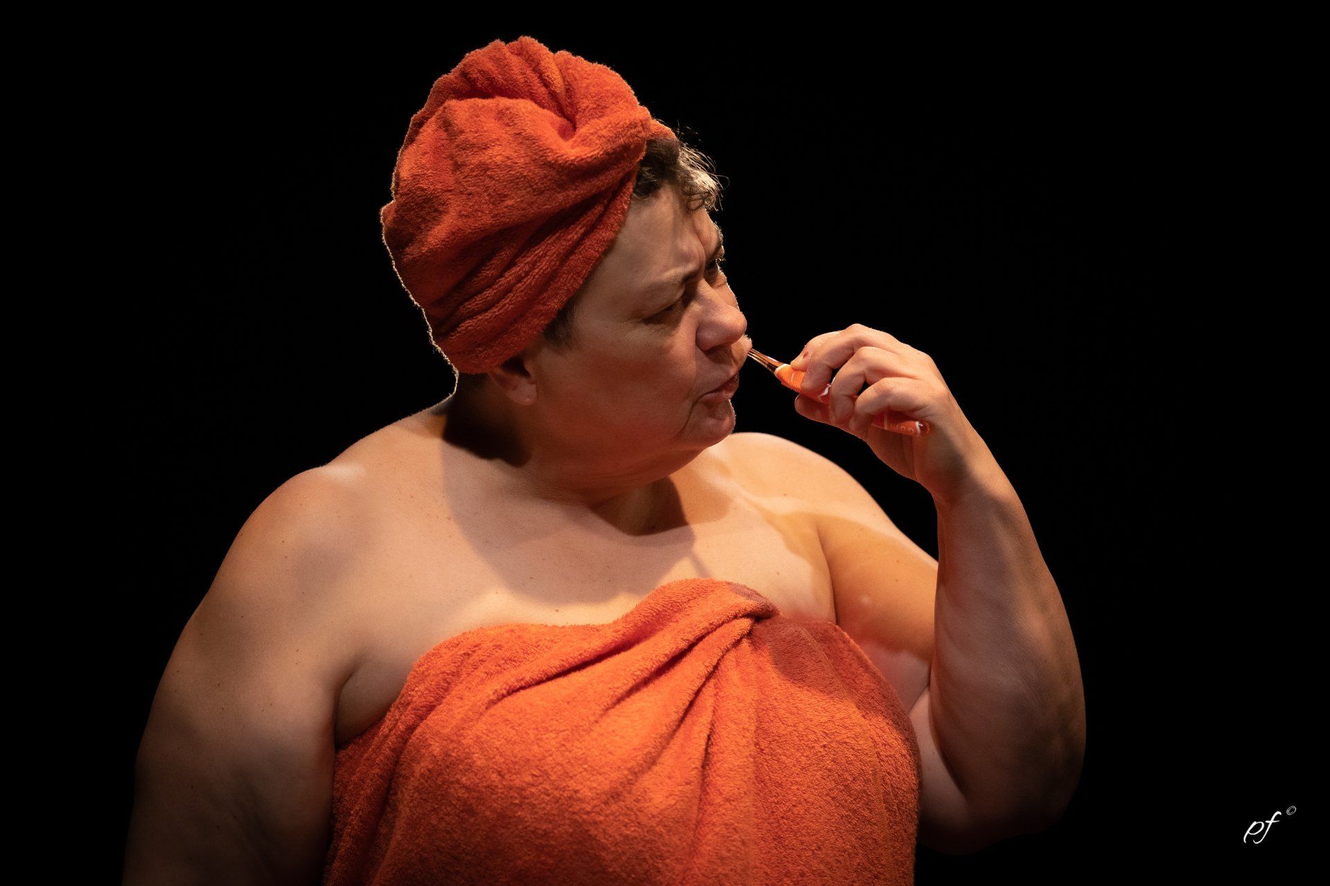 L’écriture fluide et poétique, pourtant concrète et factuelle, révèle un véritable personnage théâtral dans toute sa complexité. Le texte ayant une puissance telle, il n'y a que son autrice elle-même pour interpréter ce personnage avec justesse. Seule en scène incontestablement. Quel endroit plus propice aux confidences qu'une salle de bains ? « Miroir, oh mon beau miroir... » Lieu ultime où l'on travaille son apparence, théâtre où l'on répète, où l'on interprète différents personnages mais aussi lieu de tous les désenchantements face à son reflet. Nous sommes dans un petit théâtre du quotidien.